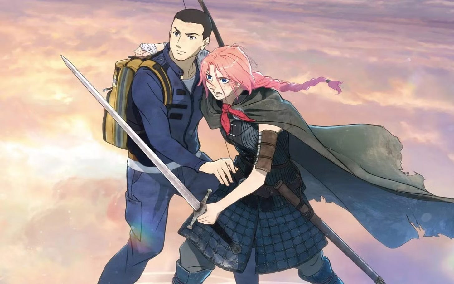Technically, this afterlife is the “Otherworld,” while there’s a happier “Infinite Realm” above, accessible by a mountain akin to Dante’s Purgatory. When Scarlet finds out that evil Claudius has built himself a castle on said mountain, amassing an army of doomed souls to storm their way into Heaven-by-any-other-nae, she sets out for revenge. Because Hell is timeless, like the Nexus in Star Trek, she encounters a modern-day medic named Hijiri, whose medical gear, superior to those of the otherwsie medieval folks in the afterlife, makes him seem to them a near-miraculous, Christ-like healer. Because, yes, you can die again in Hell, disintegrating into leaves.