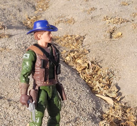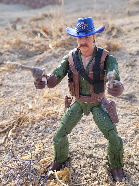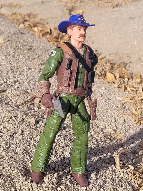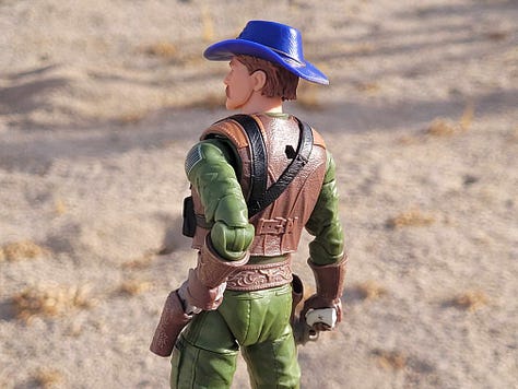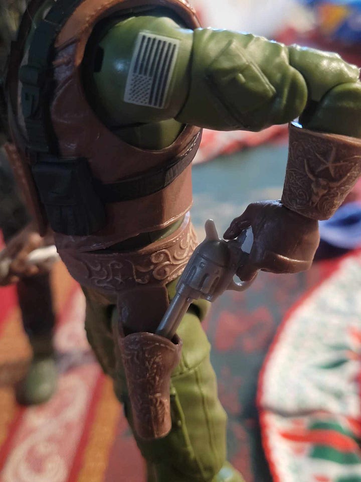 The western flourishes on his gloves, belt, and boots are nicely done, while the green gear underneath is flight-suit styled. If the pistols look unusually plasticky, it’s probably because they’re meant to stay in the holsters most of the time, and it’s the handles where all the details went. Wild Bill is the least likely figure to see a re-release, since he only ever came with the Dragonfly.