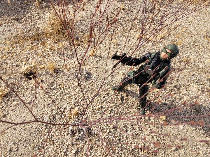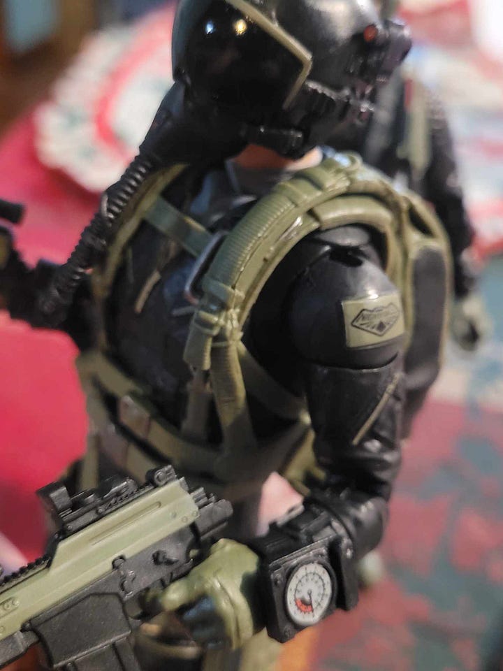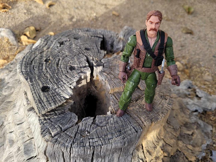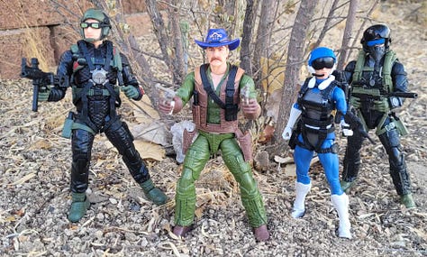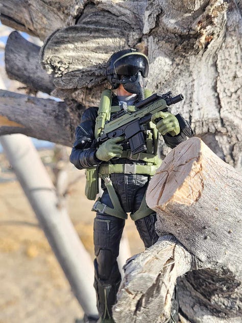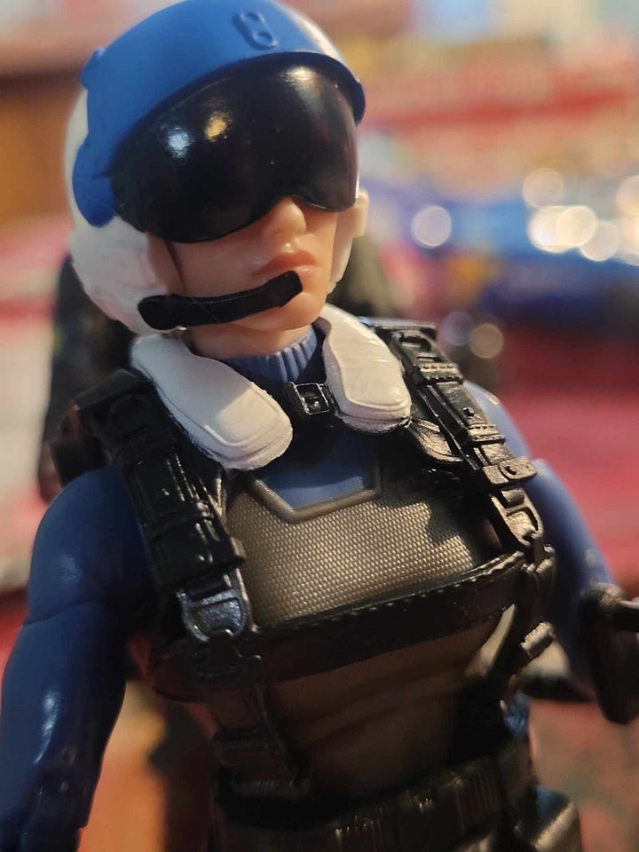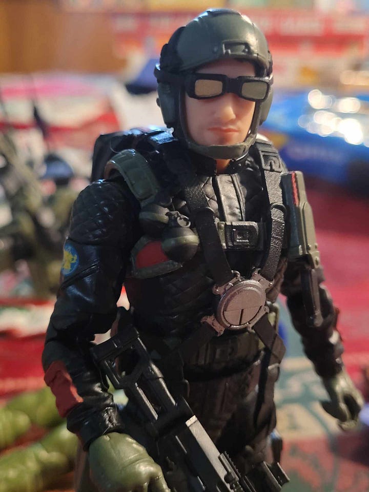 So what’s wrong with his head? To start with, the face sculpt is really soft, resembling the Selfie Series fan-scans rather than the sculpted details on Wild Bill. Then there’s the helmet with the skinny chin strap that never looks quite symmetrical. He also comes with two sets of goggles — one that goes over his helmet, and another that just fits on his head, but both look more like the battery powered shutter-sync 3D glasses I used to watch Avatar with than any kind of para-troop gear. (He looks better with Wild Bill’s sunglasses tucked into his helmet, but Wild Bill can't wear either of the goggles, so it’s not a fair trade. His red baseball cap looks okay, but I’m strongly considering switching out his head, maybe for one of the extras in the Steel Corps set.