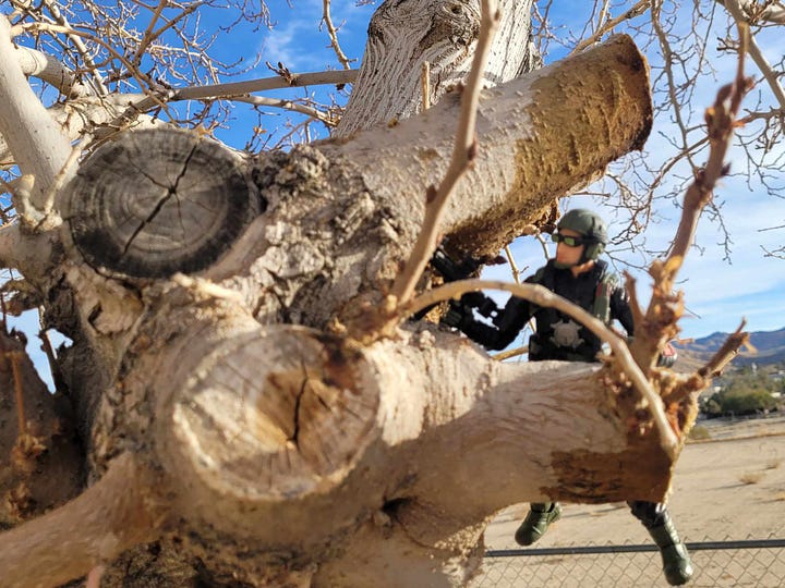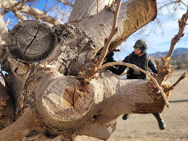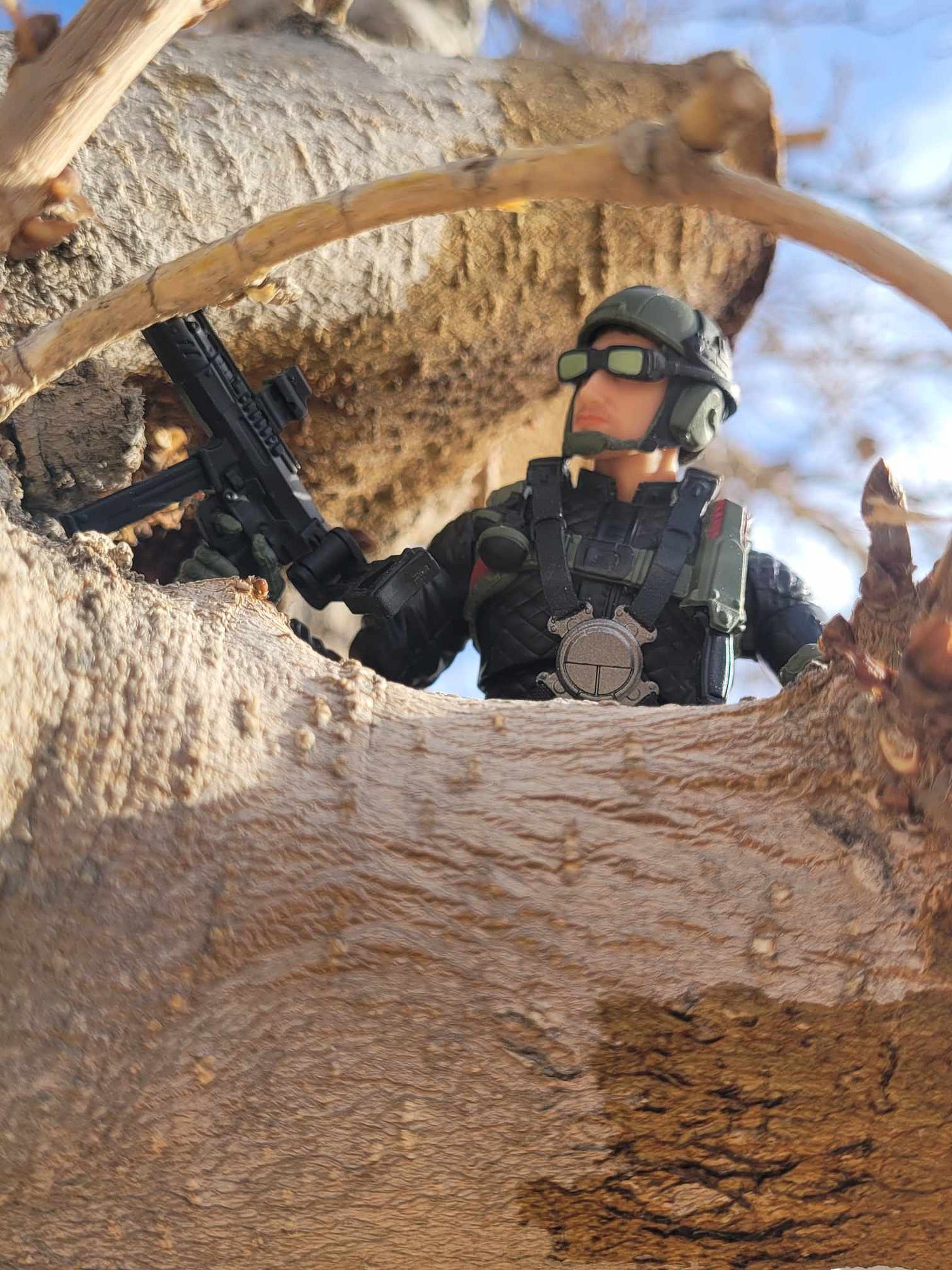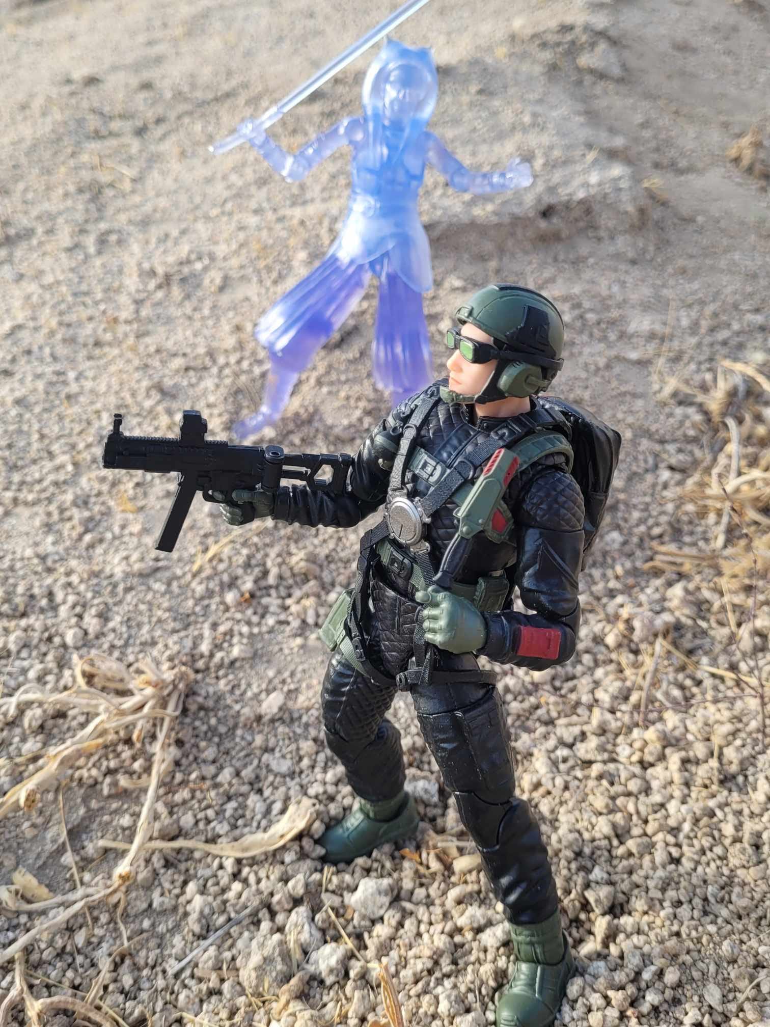 So what’s wrong with his head? To start with, the face sculpt is really soft, resembling the Selfie Series fan-scans rather than the sculpted details on Wild Bill. Then there’s the helmet with the skinny chin strap that never looks quite symmetrical. He also comes with two sets of goggles — one that goes over his helmet, and another that just fits on his head, but both look more like the battery powered shutter-sync 3D glasses I used to watch Avatar with than any kind of para-troop gear. (He looks better with Wild Bill’s sunglasses tucked into his helmet, but Wild Bill can't wear either of the goggles, so it’s not a fair trade. His red baseball cap looks okay, but I’m strongly considering switching out his head, maybe for one of the extras in the Steel Corps set.
