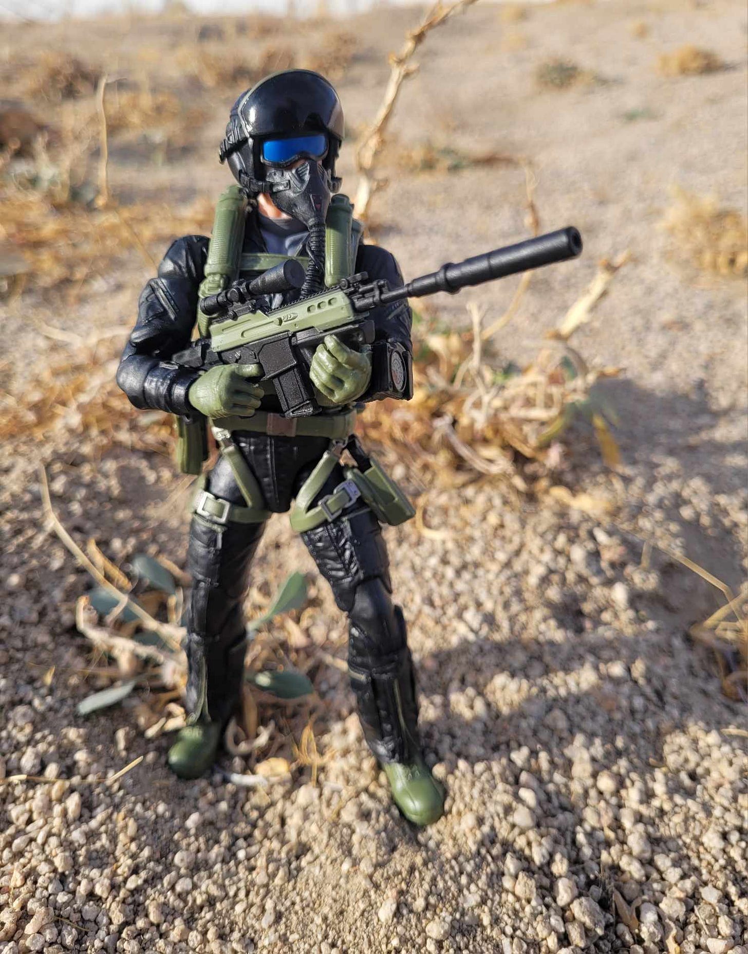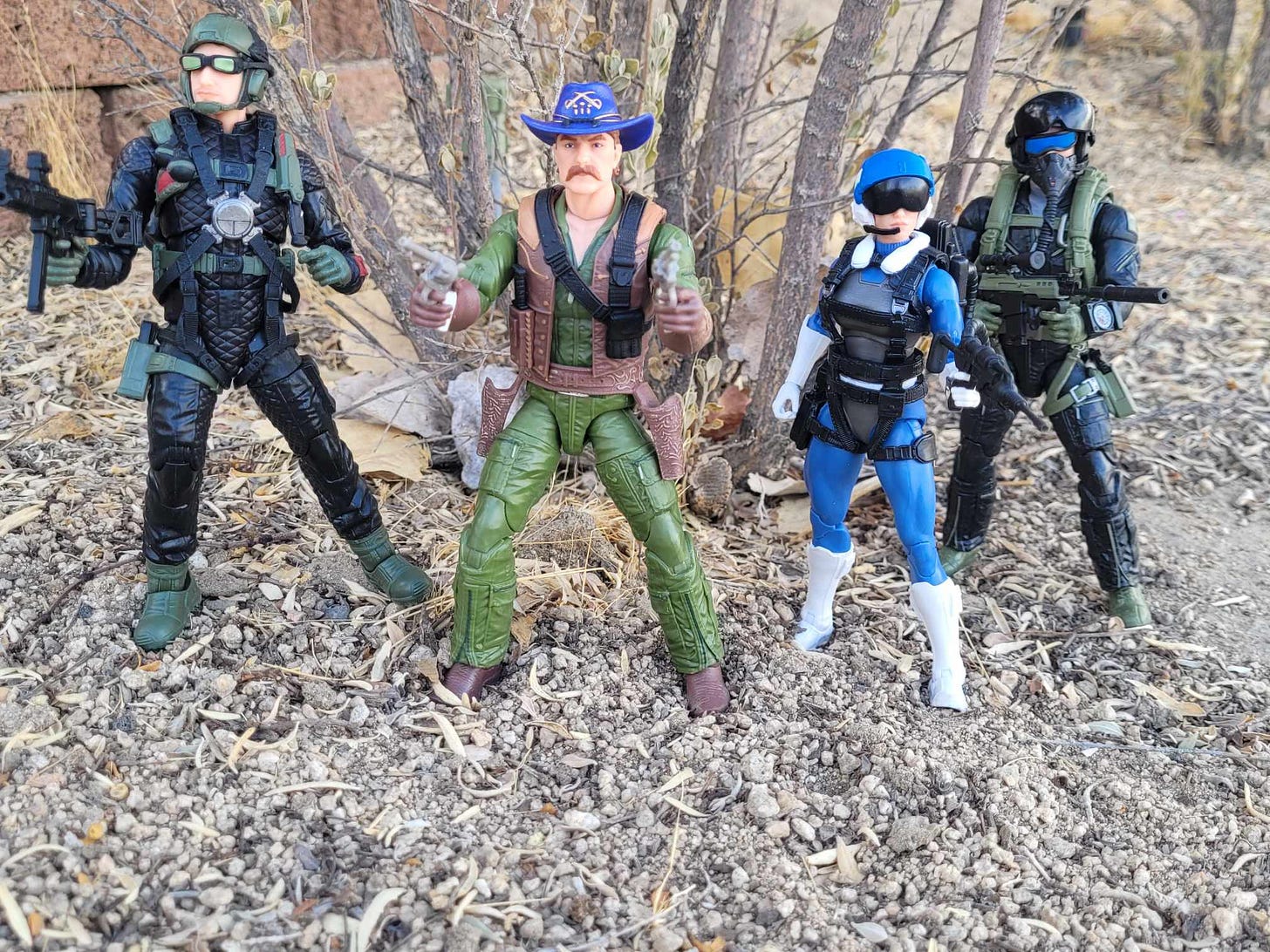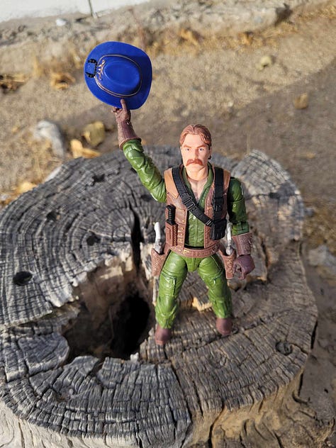 Wild Bill was one of the worst figures I ever owned in the vintage line, but his update is excellent, thanks to Hasbro’s sculptors taking the original design and simply adding a level of detail it deserves. My one gripe is that the sunglasses don’t stay on very well at all — they neither slot nor peg into his head, but just rest there, waiting to fall off. A helicopter pilot needs sunglasses, probably more than we need to see his eyes. But this is partly because of a gimmick wherein his hair is removable, replaceable with a hairpiece that has his hat attached. This despite him coming with another hat that already fits snugly on his un-hatted hairpiece. Was this so he could hold his hat in his hand? If so, let me just say that grip doesn’t work too well — the one photo in his gallery that has hat in hand took several attempts to capture without it immediately falling out.